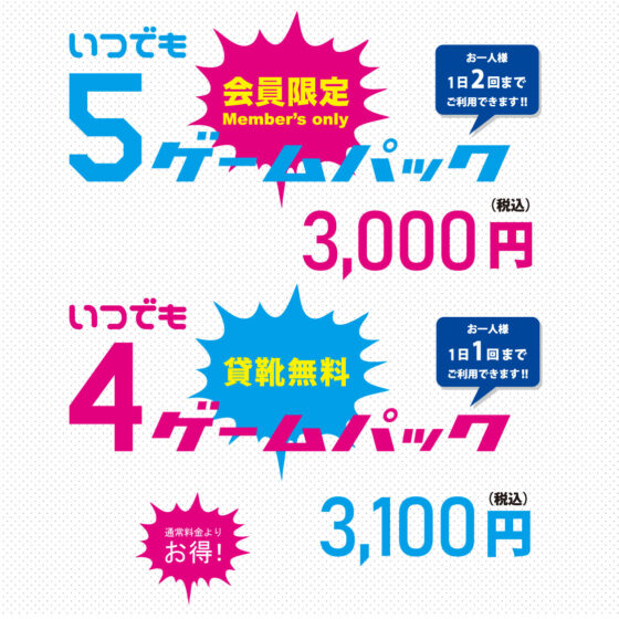 その他、各種お得なゲームパックもございますので、詳しくはフロントへご確認下さいませ。