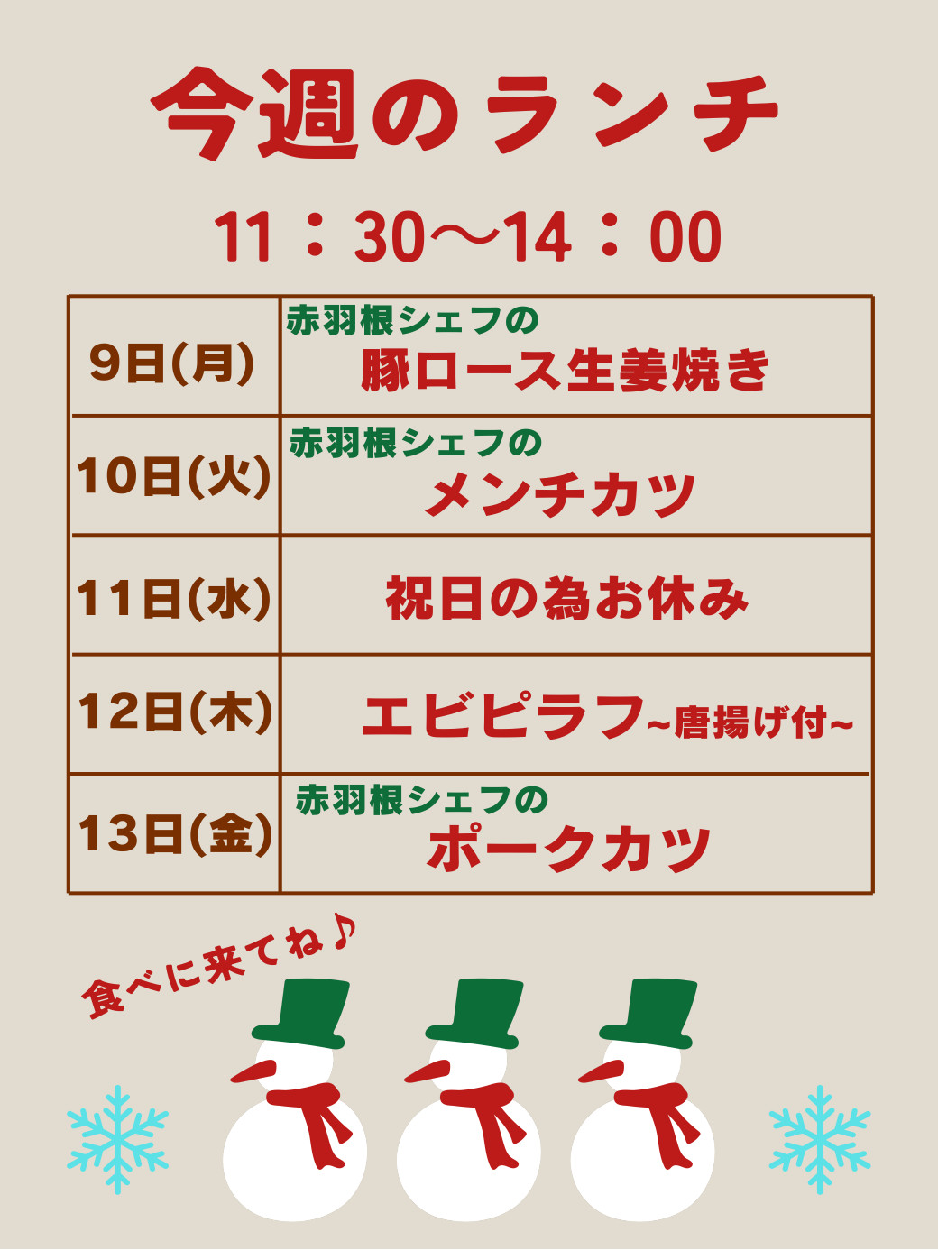 毎週担当シェフが考えたメニューをご提供しております!