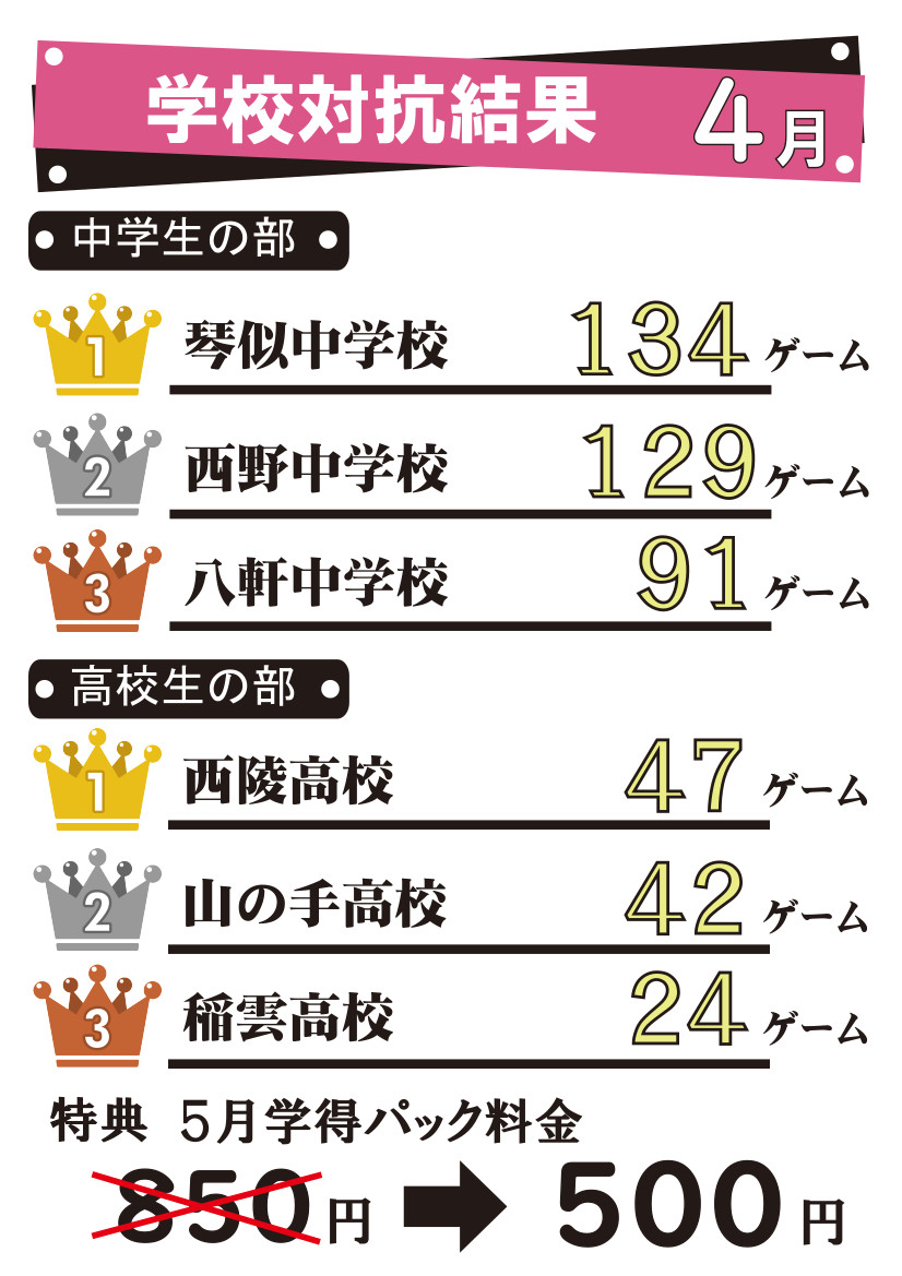 4月学校対抗イベントにご参加の皆様ありがとうございました☆ 中学校、高校の第1位が決定致しました